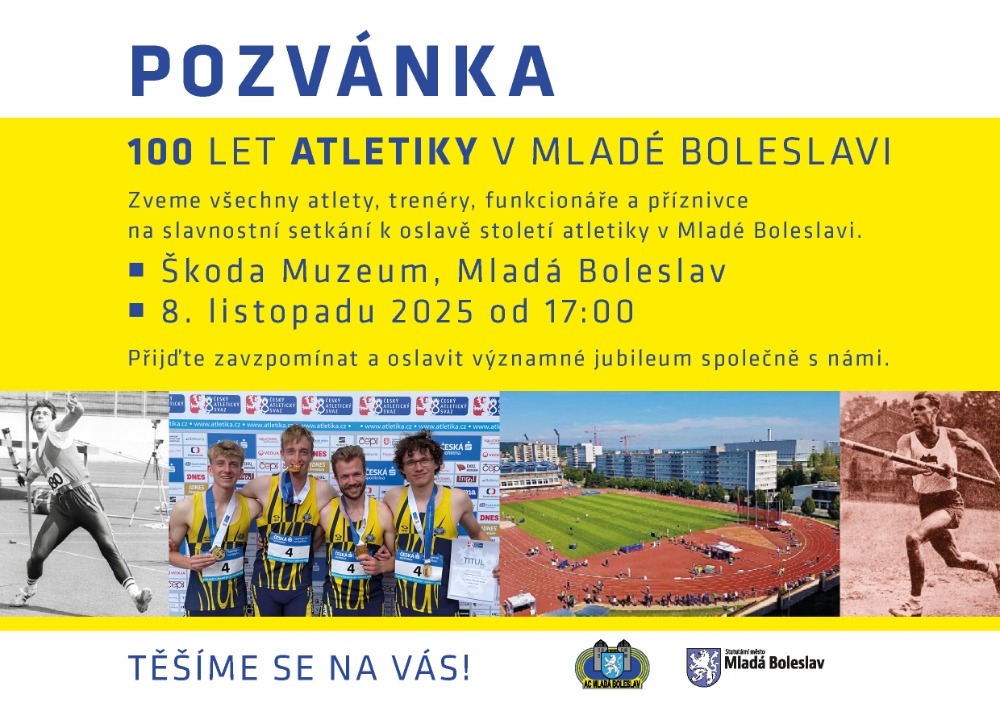 Přijďte s námi oslavit století sportovní tradice, úspěchů a příběhů, které formovaly atletiku v Mladé Boleslavi. Těšit se můžete na: Budeme velmi potěšeni, pokud s námi přijdete oslavit toto mimořádné výročí. Neváhejte pozvat i další atlety – čím více nás bude, tím slavnostnější atmosféra nás čeká.